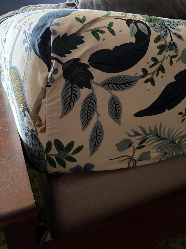 We've added new color options to our best-selling Rifle Paper Co. Peacock print fitted sheets collection, which features a sophisticated scene of birds perched among winding branches and blooming flowers. Cast in a striking color palette of dusk blue, fern green, olive, pink, aqua, peach, and taupe, this design was created to be layered with our Laurel Sateen bedding (sold separately). This bedding collection is crafted of buttery-soft and breathable sateen and has a subtle sheen that's perfect for all-season comfort. Rifle Paper Co.'s hand-painted designs of floral blooms and bold colors bring beauty to your everyday. Part of our Rifle Paper Co. x The Company Store collection.