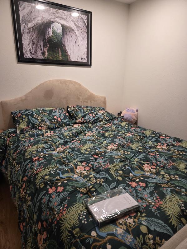 We've added new color options to our best-selling Rifle Paper Co. Peacock print flat sheets collection, which features a sophisticated scene of birds perched among winding branches and blooming flowers. Cast in a striking color palette of dusk blue, fern green, olive, pink, aqua, peach, and taupe, this design was created to be layered with our Laurel Sateen bedding (sold separately). This bedding collection is crafted of buttery-soft and breathable sateen and has a subtle sheen that's perfect for all-season comfort. Rifle Paper Co.'s hand-painted designs of floral blooms and bold colors bring beauty to your everyday. Part of our Rifle Paper Co. x The Company Store collection.