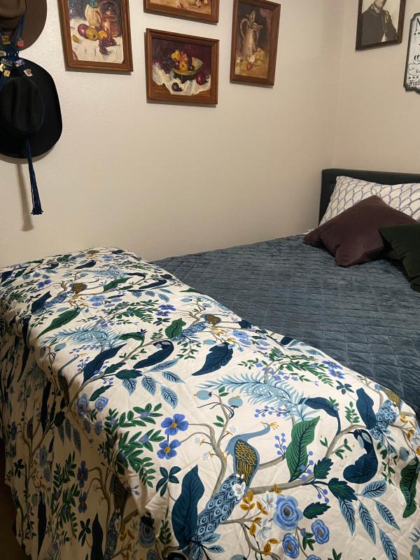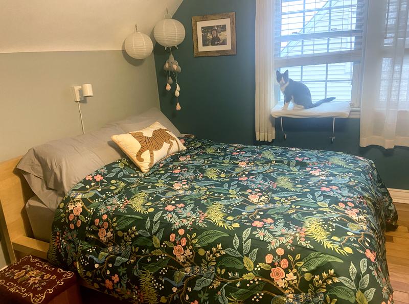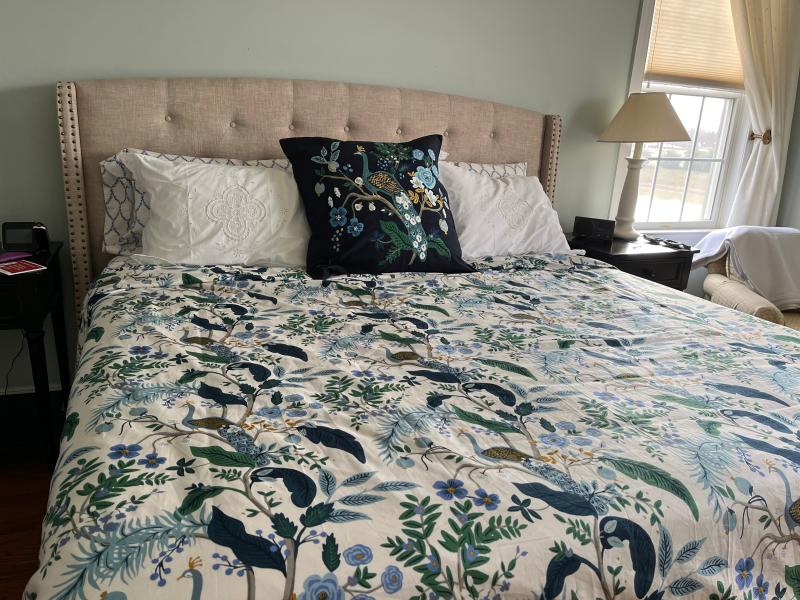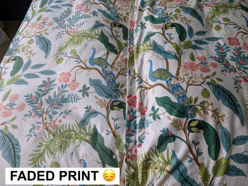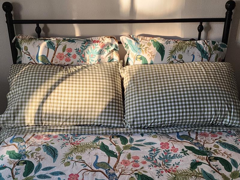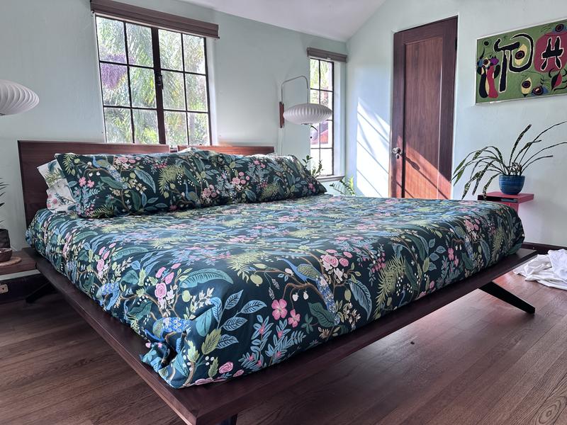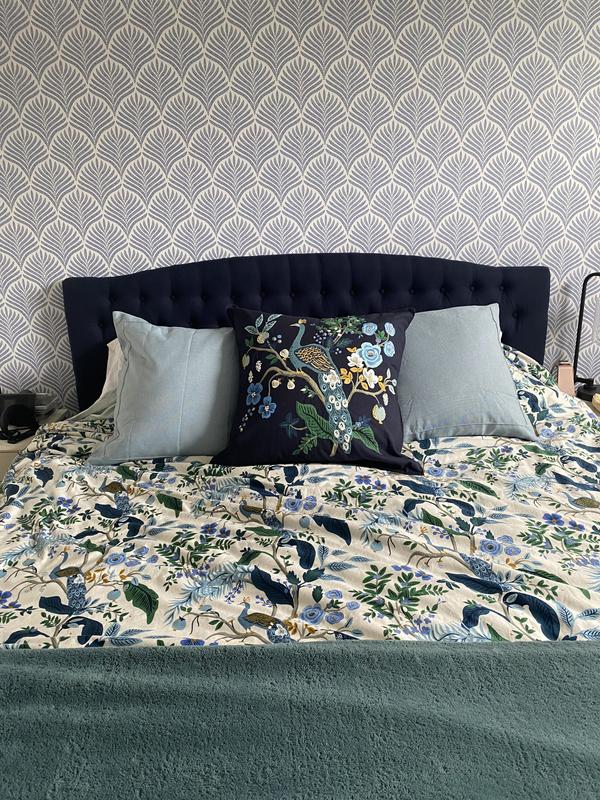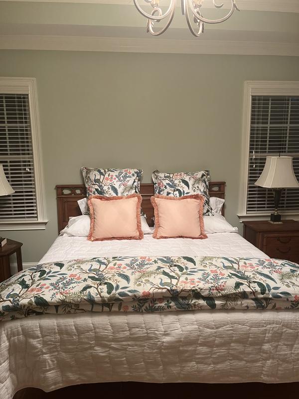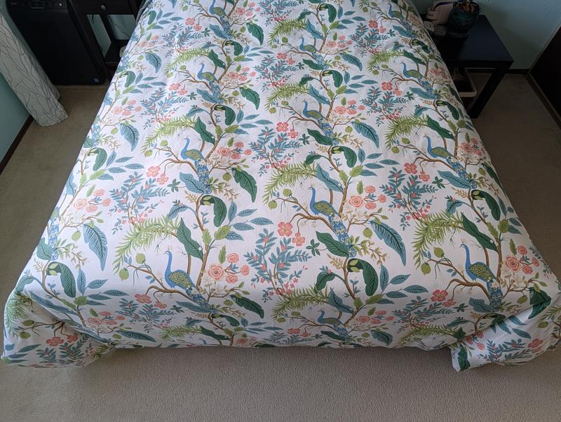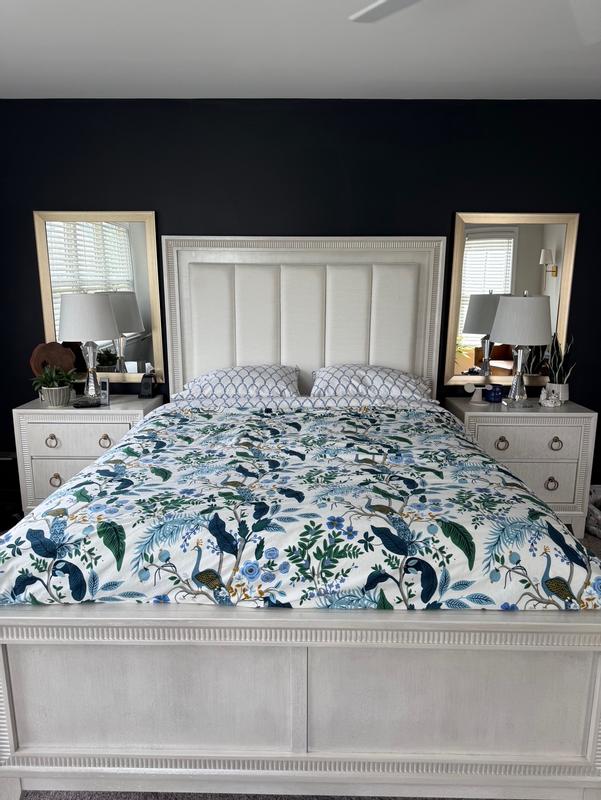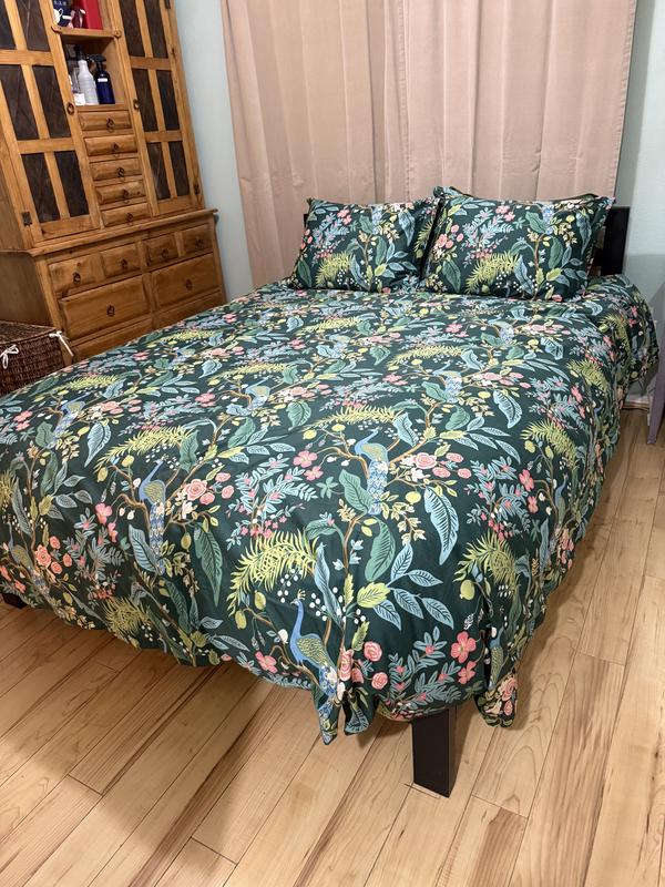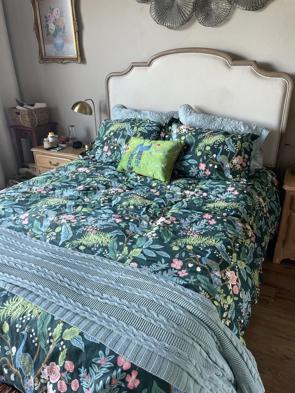 This Peacock Print Rifle Paper Co. Duvet Cover is made from breathable sateen and features a scene with winding branches, birds, and flowers. The buttery-soft material adds a subtle sheen to the bed and is perfect for all-season comfort. Select from a range of new colors, including evergreen, ivory, cream, or blush. Part of the Rifle Paper Co. x The Company Store collection.
