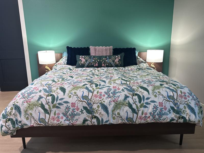 The duvet cover is described as soft, luxurious, and high-quality, with many praising the rich colors and sateen fabric. Customers report that the duvet cover brightens up their bedrooms and elevates the look. A few minor criticisms were mentioned, such as the fabric wrinkling easily and the pattern repeat being too frequent, but the vast majority of reviews were extremely positive.