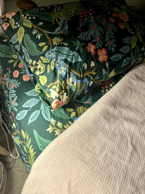 The Rifle Paper Co. Peacock Print Sateen Fitted Sheet features a sophisticated scene of birds perched among winding branches and blooming flowers. It's available in your choice of evergreen, ivory, cream, or blush. The fitted sheet is made of buttery and breathable sateen, which has a subtle sheen and is perfect for all-season comfort. Part of the Rifle Paper Co. x The Company Store collection.