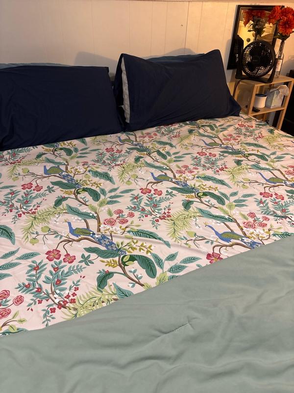 Our Rifle Paper Co. Peacock Print Sateen Flat Sheet features a sophisticated scene of birds perched among winding branches and blooming flowers. It's crafted of breathable sateen, which brings a subtle sheen and is perfect for all-season comfort. Choose evergreen, ivory, cream, or blush. Part of the Rifle Paper Co. x The Company Store collection.