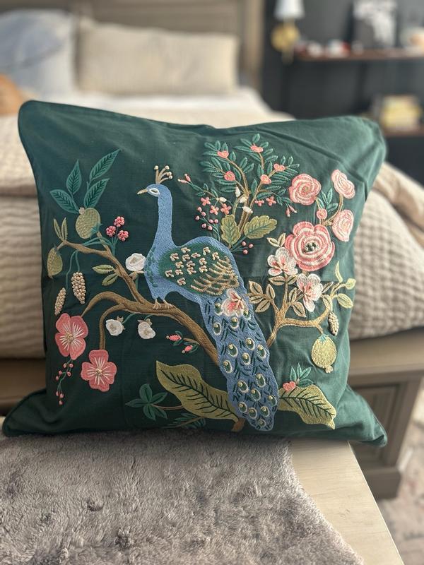 Our Rifle Paper Co. Square Pillow Cover features a decorative peacock print and a lush landscape of winding branches and blooming flowers. It's available in your choice of evergreen, ivory, cream, or navy and coordinates with our Peacock sateen bedding (sold separately). Part of the Rifle Paper Co. x The Company Store collection.