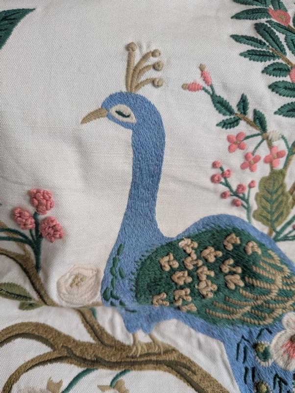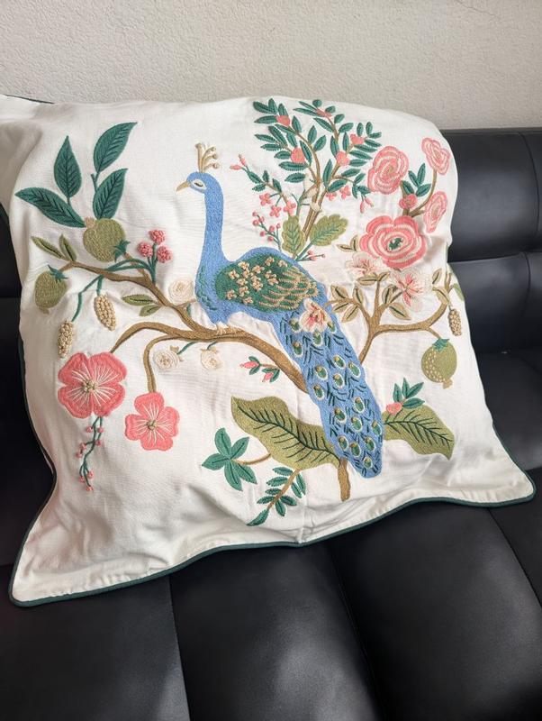 Customers overwhelmingly praise the pillow cover for its exceptional hand-embroidered details, premium 100% cotton slub fabric, and striking peacock-inspired design. Reviewers consistently highlight the intricate stitching that adds luxurious texture and artisanal quality, describing the thick, sturdy material as high-end and more expensive-feeling than comparable covers. The vibrant colors and whimsical pattern are called stunning and transformative, with many appreciating the hidden, smooth-operating zipper and meticulous construction. A few note the cover runs larger than expected, though most still find it lovely. Overall, customers consider it a well-crafted, visually striking investment piece.