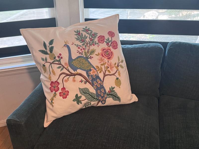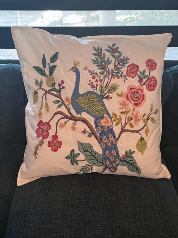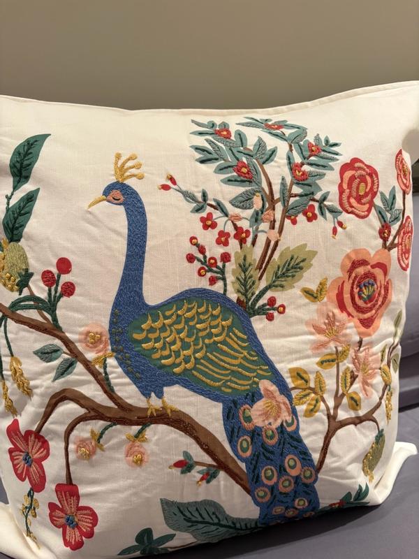 Customers overwhelmingly praise the pillow cover for its exceptional hand-embroidered details, premium 100% cotton slub fabric, and striking peacock-inspired design. Reviewers consistently highlight the intricate stitching that adds luxurious texture and artisanal quality, describing the thick, sturdy material as high-end and more expensive-feeling than comparable covers. The vibrant colors and whimsical pattern are called stunning and transformative, with many appreciating the hidden, smooth-operating zipper and meticulous construction. A few note the cover runs larger than expected, though most still find it lovely. Overall, customers consider it a well-crafted, visually striking investment piece.