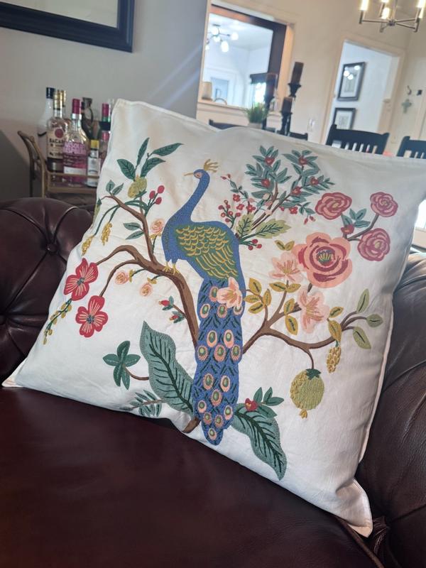 Our Rifle Paper Co. Square Pillow Cover features a decorative peacock print and a lush landscape of winding branches and blooming flowers. It's available in your choice of evergreen, ivory, cream, or navy and coordinates with our Peacock sateen bedding (sold separately). Part of the Rifle Paper Co. x The Company Store collection.
