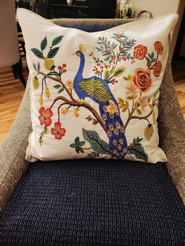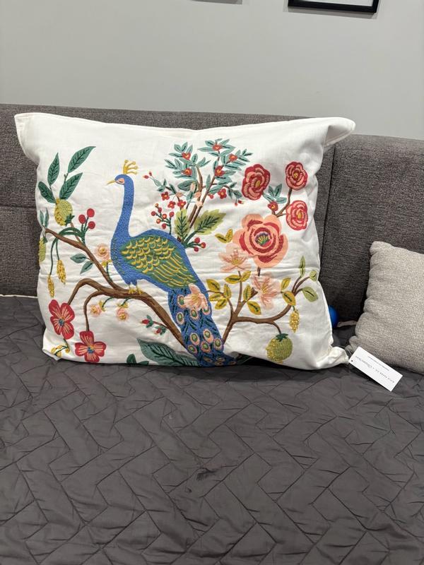 Our Rifle Paper Co. Square Pillow Cover features a decorative peacock print and a lush landscape of winding branches and blooming flowers. It's available in your choice of evergreen, ivory, cream, or navy and coordinates with our Peacock sateen bedding (sold separately). Part of the Rifle Paper Co. x The Company Store collection.