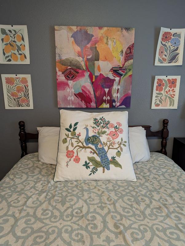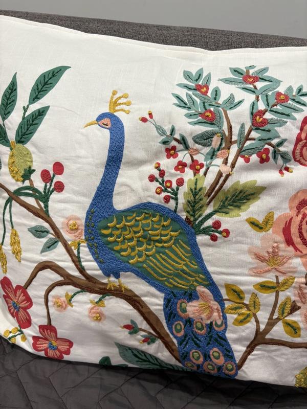 Customers overwhelmingly praise the pillow cover for its exceptional hand-embroidered details, premium 100% cotton slub fabric, and striking peacock-inspired design. Reviewers consistently highlight the intricate stitching that adds luxurious texture and artisanal quality, describing the thick, sturdy material as high-end and more expensive-feeling than comparable covers. The vibrant colors and whimsical pattern are called stunning and transformative, with many appreciating the hidden, smooth-operating zipper and meticulous construction. A few note the cover runs larger than expected, though most still find it lovely. Overall, customers consider it a well-crafted, visually striking investment piece.