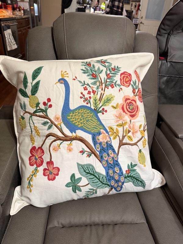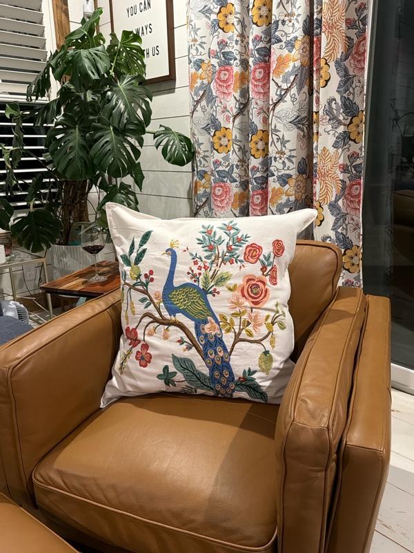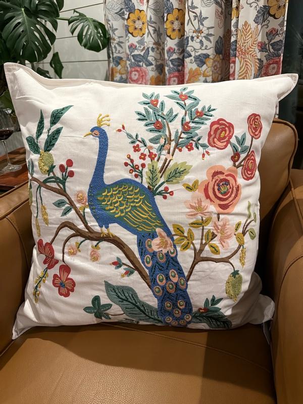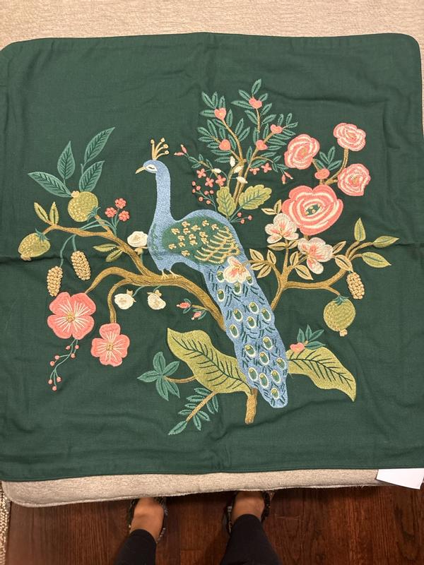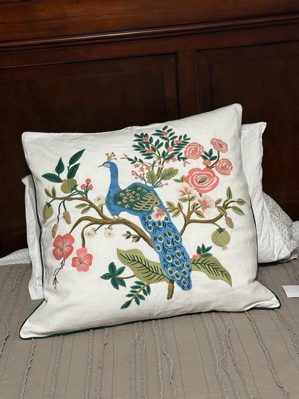 Our Rifle Paper Co. Square Pillow Cover features a decorative peacock print and a lush landscape of winding branches and blooming flowers. It's available in your choice of evergreen, ivory, cream, or navy and coordinates with our Peacock sateen bedding (sold separately). Part of the Rifle Paper Co. x The Company Store collection.