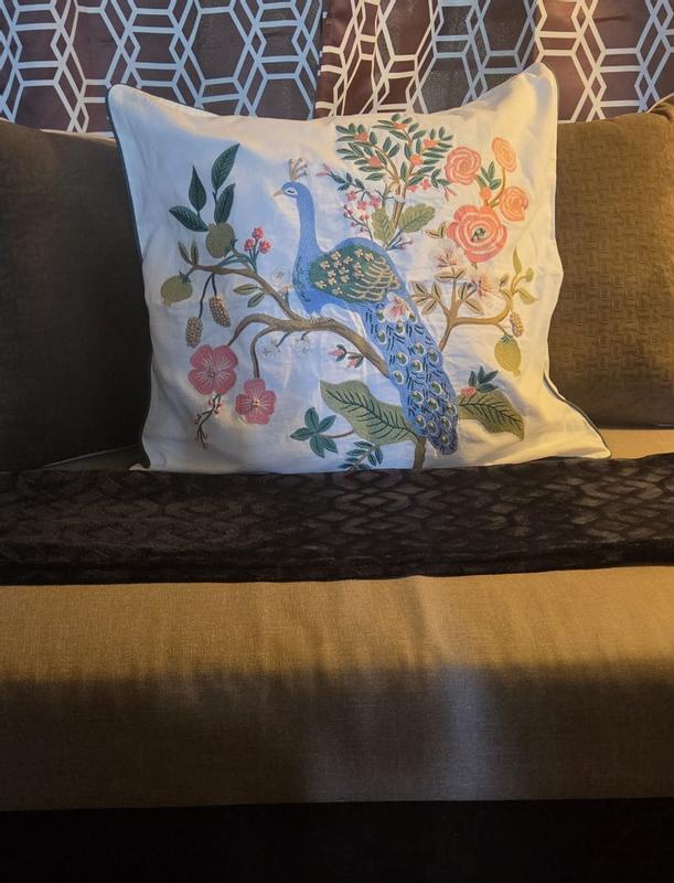 Our Rifle Paper Co. Square Pillow Cover features a decorative peacock print and a lush landscape of winding branches and blooming flowers. It's available in your choice of evergreen, ivory, cream, or navy and coordinates with our Peacock sateen bedding (sold separately). Part of the Rifle Paper Co. x The Company Store collection.