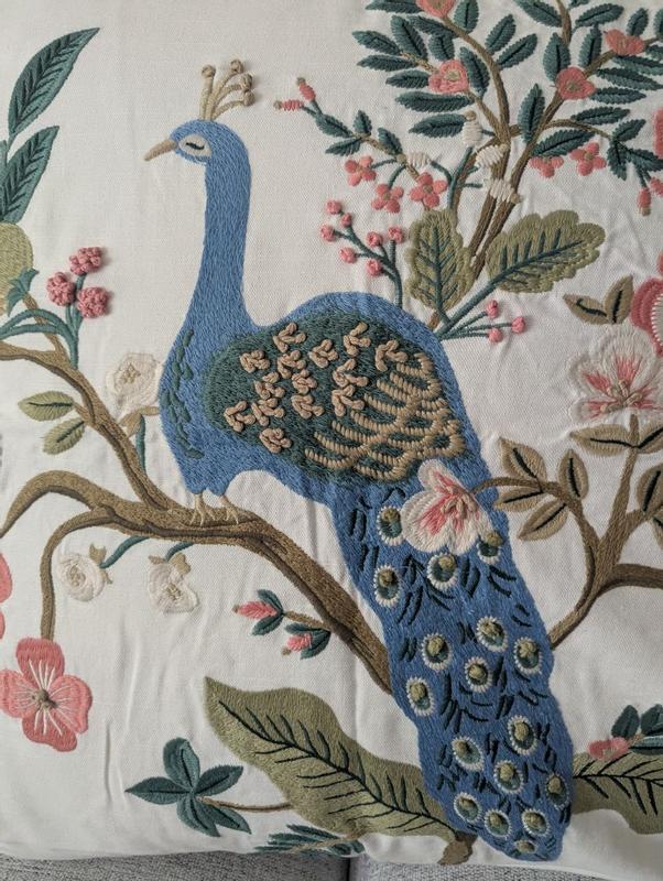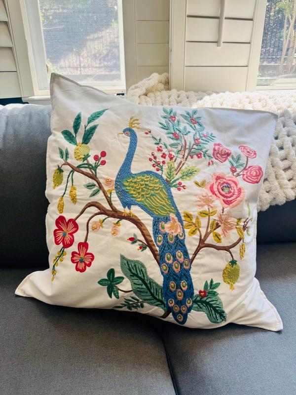 Customers overwhelmingly praise the pillow cover for its exceptional hand-embroidered details, premium 100% cotton slub fabric, and striking peacock-inspired design. Reviewers consistently highlight the intricate stitching that adds luxurious texture and artisanal quality, describing the thick, sturdy material as high-end and more expensive-feeling than comparable covers. The vibrant colors and whimsical pattern are called stunning and transformative, with many appreciating the hidden, smooth-operating zipper and meticulous construction. A few note the cover runs larger than expected, though most still find it lovely. Overall, customers consider it a well-crafted, visually striking investment piece.