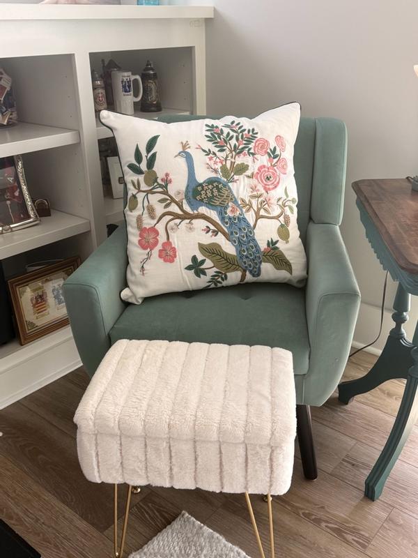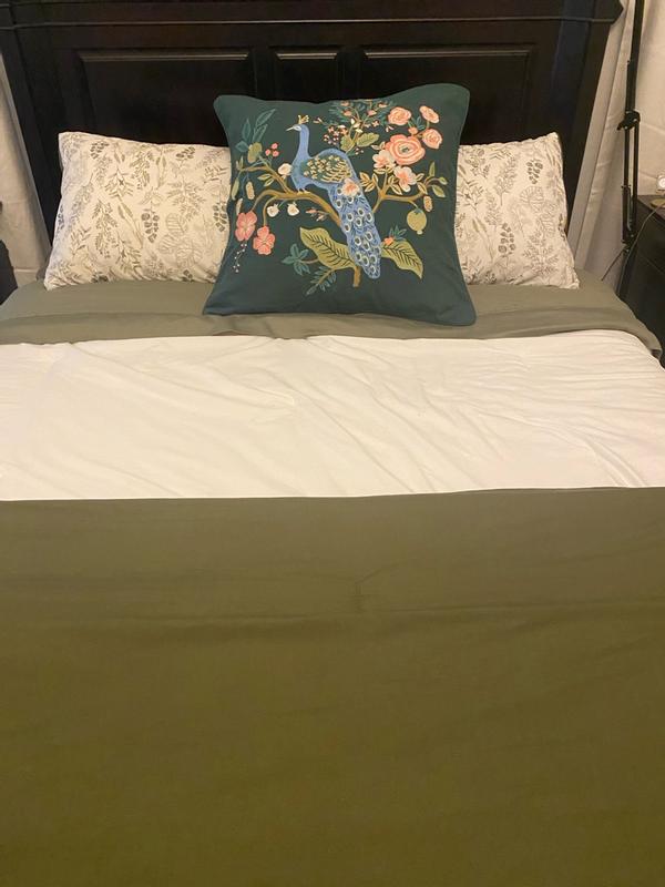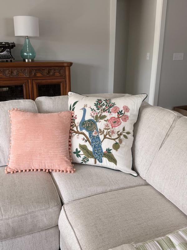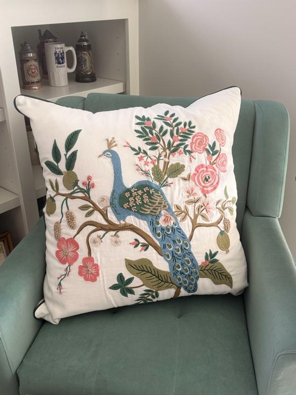 Our Rifle Paper Co. Square Pillow Cover features a decorative peacock print and a lush landscape of winding branches and blooming flowers. It's available in your choice of evergreen, ivory, cream, or navy and coordinates with our Peacock sateen bedding (sold separately). Part of the Rifle Paper Co. x The Company Store collection.
