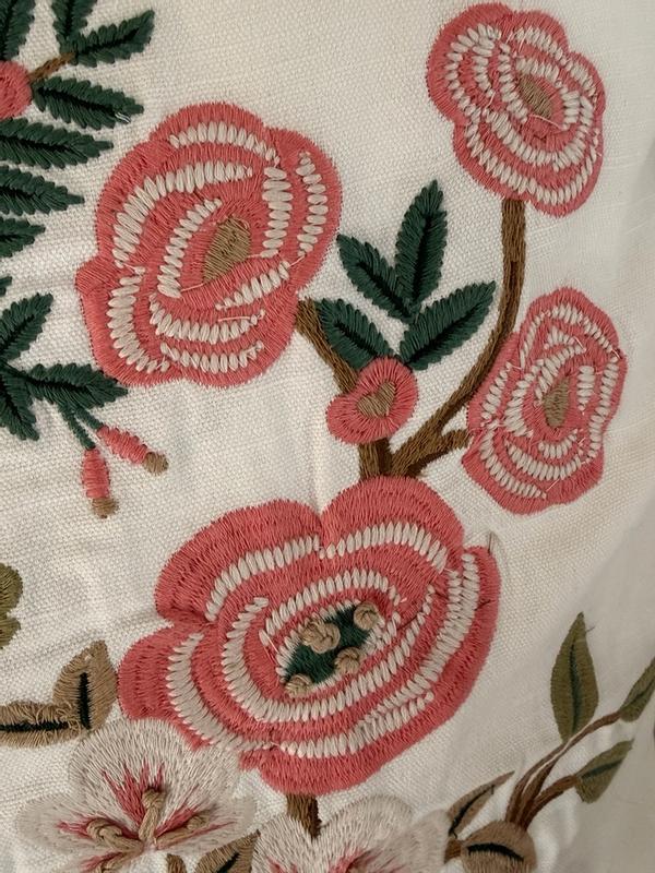 - Hand embroidered accents add a lovely detail