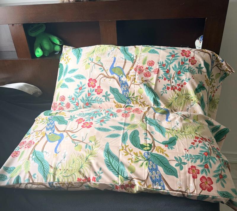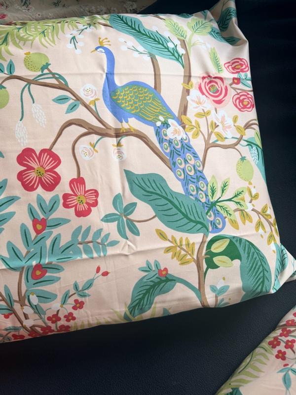 The Rifle Paper Co. Peacock Sateen Pillowcase Set features a sophisticated scene with winding branches, perching birds, and blooming flowers. The buttery-soft sateen has a subtle sheen, and it's breathable enough for all-season comfort. Choose from a range of fresh new color options, including evergreen, ivory, cream, or blush. Part of the Rifle Paper Co. x The Company Store collection.