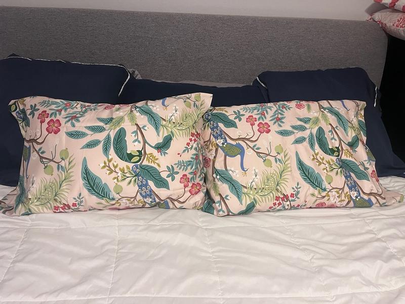 The Peacock pillowcases and sheet set are praised for their beautiful, vibrant, and trendy design. Customers find the rich colors and intricate pattern visually appealing and uplifting. The fabric is described as smooth, soft, and of high quality, though it may not be as soft as cotton initially but softens with washing. Many appreciate the generous size and deep pockets of the sheets, which stay in place well. Overall, the product is considered excellent value, with customers stating they would purchase again and highly recommend the set. Some minor criticisms include the pillowcases being a snug fit for overstuffed pillows and the fabric not being as soft as some would prefer.