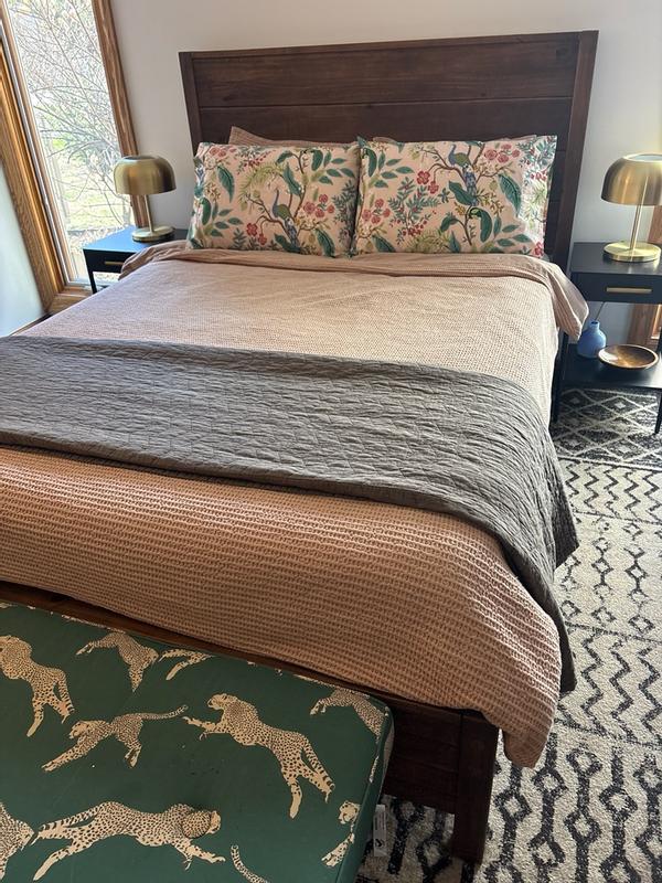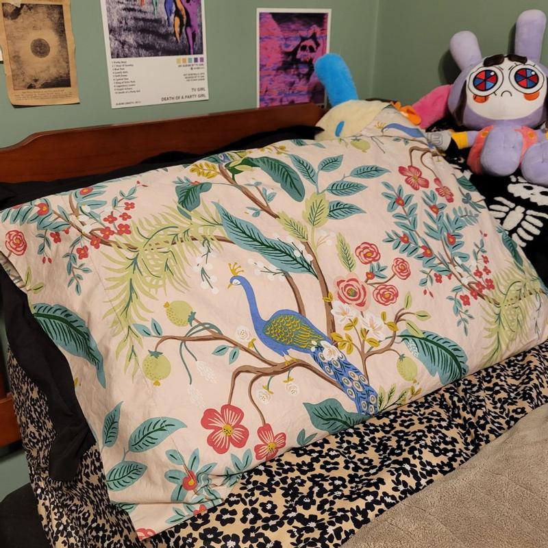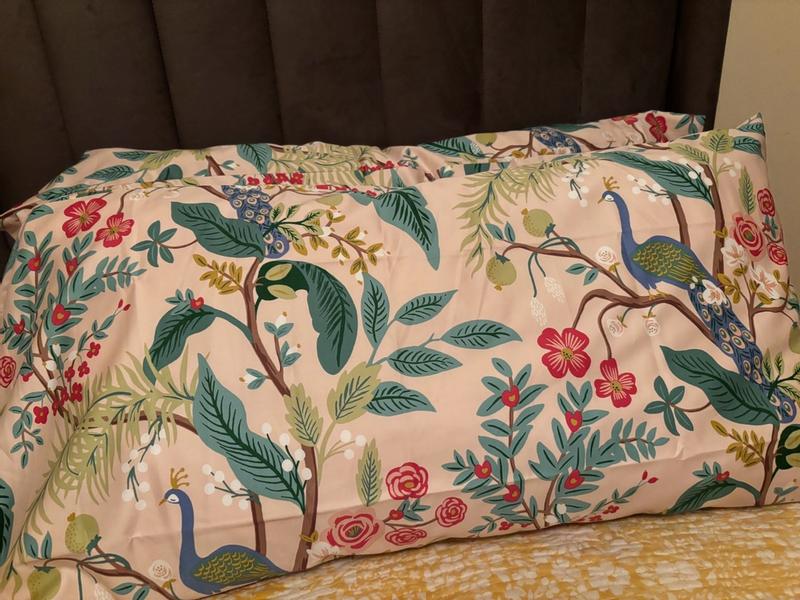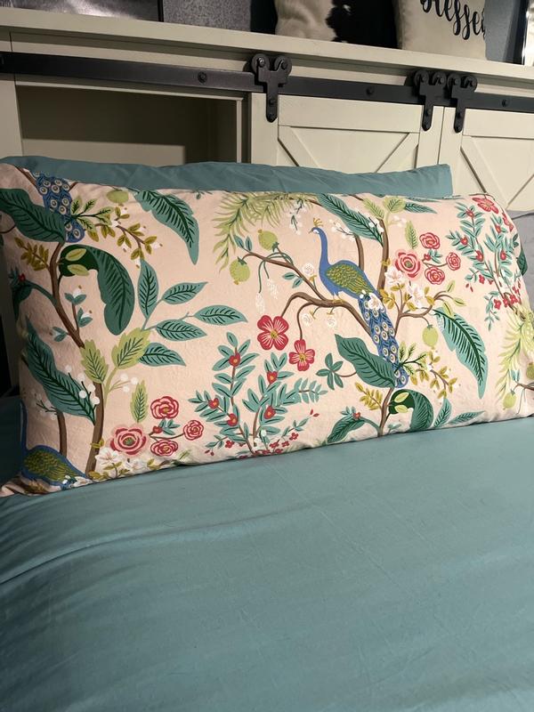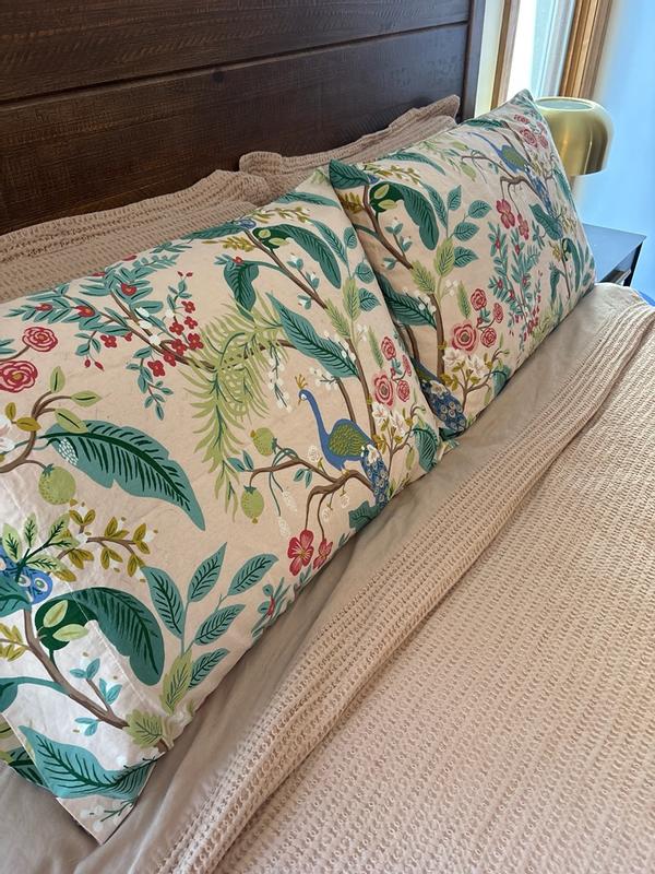 The Rifle Paper Co. Peacock Sateen Pillowcase Set features a sophisticated scene with winding branches, perching birds, and blooming flowers. The buttery-soft sateen has a subtle sheen, and it's breathable enough for all-season comfort. Choose from a range of fresh new color options, including evergreen, ivory, cream, or blush. Part of the Rifle Paper Co. x The Company Store collection.