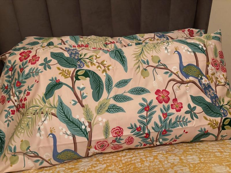 The Peacock pillowcases and sheet set are praised for their beautiful, vibrant, and trendy design. Customers find the rich colors and intricate pattern visually appealing and uplifting. The fabric is described as smooth, soft, and of high quality, though it may not be as soft as cotton initially but softens with washing. Many appreciate the generous size and deep pockets of the sheets, which stay in place well. Overall, the product is considered excellent value, with customers stating they would purchase again and highly recommend the set. Some minor criticisms include the pillowcases being a snug fit for overstuffed pillows and the fabric not being as soft as some would prefer.