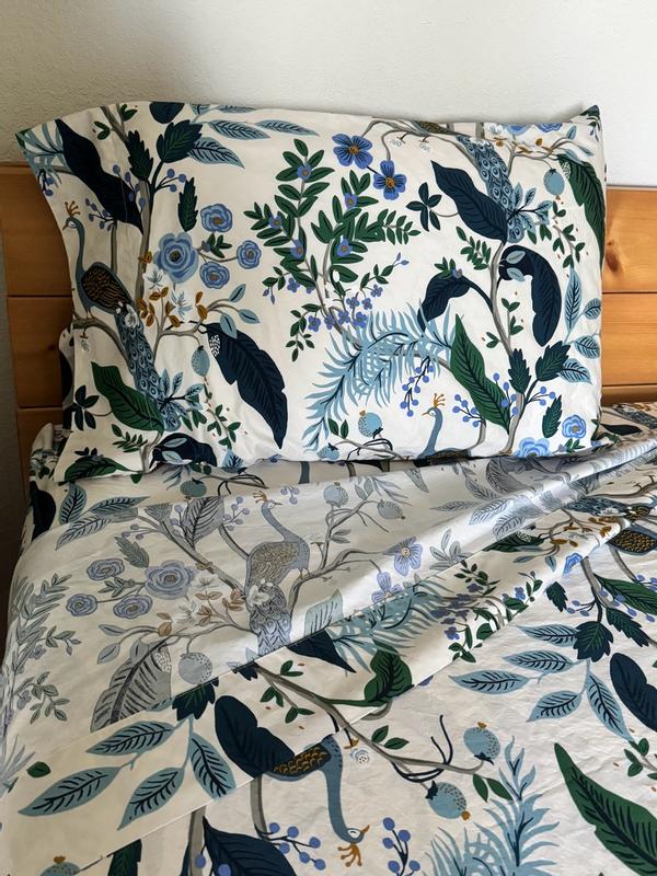 This Rifle Paper Co. Peacock Print Sateen Sheet Set features a sophisticated scene of birds perched among winding branches and blooming flowers. Cast in your choice of fresh new colors, including evergreen, ivory, cream, or blush, and crafted of buttery-soft and breathable sateen that's perfect for all-season comfort. Part of our Rifle Paper Co. x The Company Store collection.
