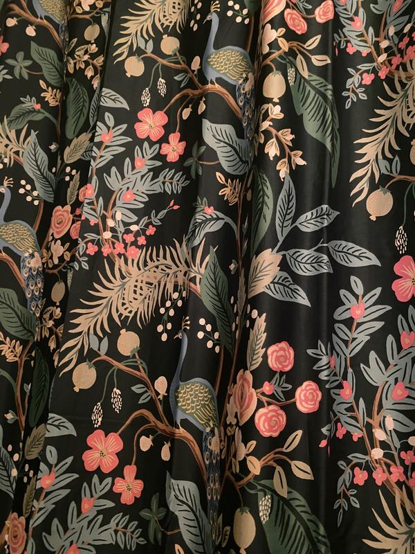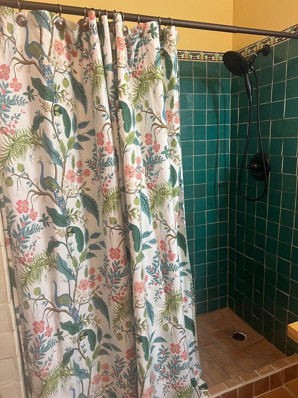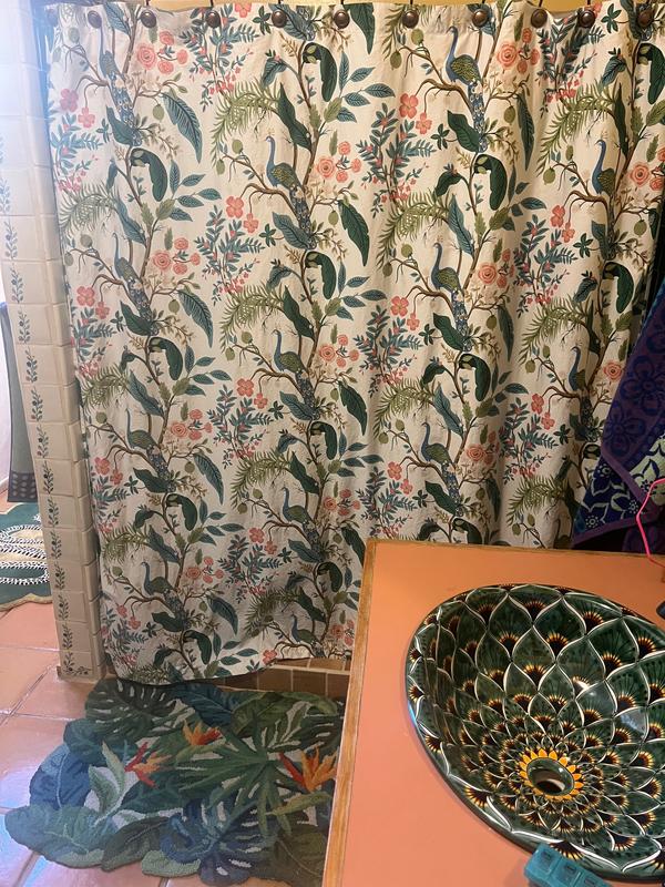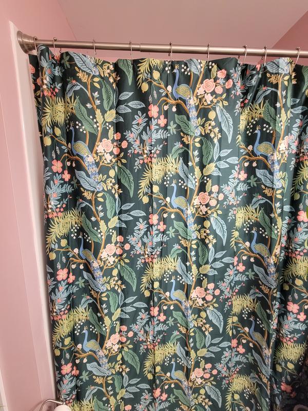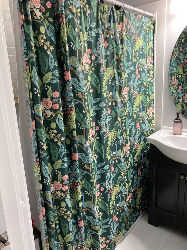 This Rifle Paper Co. Peacock Sateen Shower Curtain features a sophisticated scene of birds perched among winding branches and blooming flowers. The sateen fabric is buttery soft and comes in fresh new colors like evergreen, ivory, cream, or blush. Part of the Rifle Paper Co. x The Company Store collection.