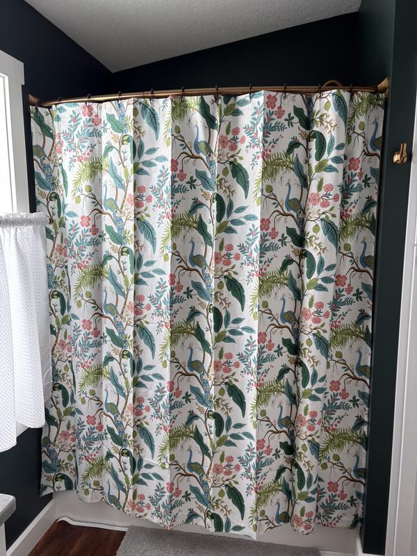 This Rifle Paper Co. Peacock Sateen Shower Curtain features a sophisticated scene of birds perched among winding branches and blooming flowers. The sateen fabric is buttery soft and comes in fresh new colors like evergreen, ivory, cream, or blush. Part of the Rifle Paper Co. x The Company Store collection.