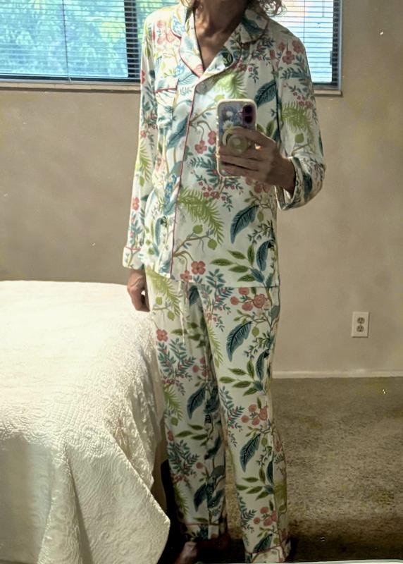 Our well-loved, customer-favorite Rifle Paper Co. TENCEL™ Modal Jersey Knit Pajama Set is back for the season in two eye-catching signature prints: lush botanicals and peacocks (Peacock) and a bright floral on a white ground (Dahlia). Striking just the right balance between cute and comfort, our two-piece pajama pants set is made of breathable TENCEL™ Modal blend, a sustainably grown fabric that’s prized for its softness, drape, and moisture-wicking properties. Part of our Rifle Paper Co. x The Company Store collection.