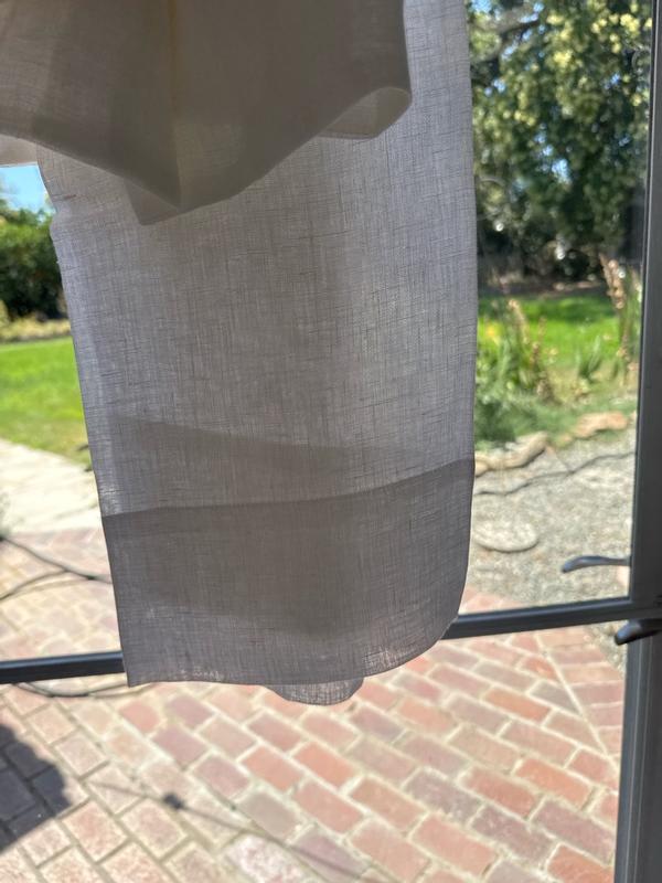 This sheer curtain is so gauzy and light! It makes a space feel very summery and beachy! I absolutely love how it filters the light that comes through it. I feel like it gives the room a soft and uplifting glow. It is very sheer, though, so you'll want to be careful where you hang it since it doesn't allow a lot of privacy. It was super easy to hang, although the window it is currently hanging over isn't its final home. (We are painting bedrooms right now, so please don't mind the painter's tape in the picture.) I do think it's pretty expensive, but I don't know a lot about curtain prices, so maybe more than $100 is typical. It seems like a lot for me, though, especially for only one panel. But it certainly does look and feel lovely.