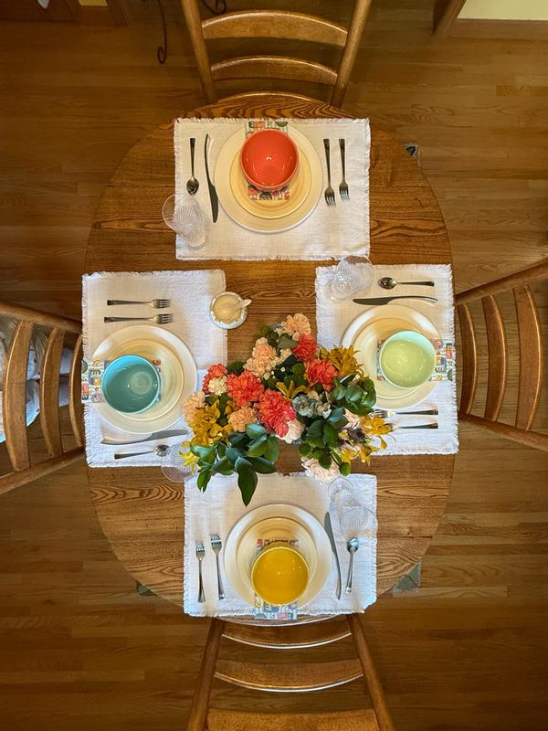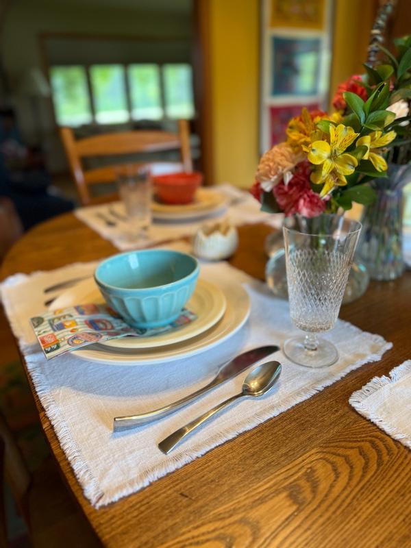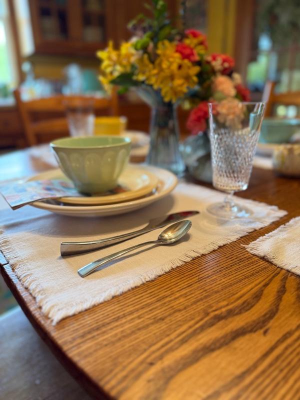 The placemats are generally well-received, with many positive comments about their appearance, quality, and versatility. Customers appreciate the crisp white color, soft cotton fabric, and delicate fringe detail. Many find the placemats to be a good size and easy to care for, though some note they may wrinkle easily and require ironing. A few reviewers had negative experiences, such as receiving an incomplete set or finding the placemats to be thinner or more delicate than expected. Some also expressed concerns about the white color being prone to staining. Despite these drawbacks, the majority of customers seem satisfied with the placemats.