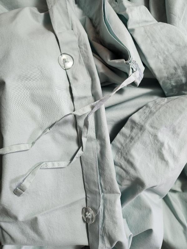 The duvet cover is made of soft, crisp, and lightweight cotton percale fabric that provides a luxurious feel. It features thoughtful design elements like internal corner ties and button closures to keep the duvet in place. While some customers noted minor issues with wrinkling and the lack of included pillow shams, the majority of reviews are very positive, describing the product as high-quality, comfortable, and durable.