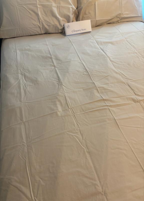 I am very pleased with the Company Store flat sheet! It fit perfectly on my queen sized bed with a crisp, plentiful foldover on the comforter, with fabric generous enough to tuck under my 14" mattress without feeling like there wasn't enough sheet. It is soft, cool, and a dream to sleep in, even after washing.