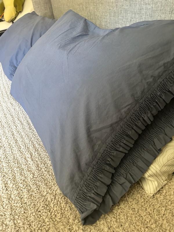 Customers overwhelmingly praise the soft, breathable 100% cotton percale fabric, describing it as luxurious and ideal for comfortable sleep with natural cooling properties. The delicate ruffled trim is celebrated as elegant and decorative, adding a high-end hotel-like aesthetic that complements bedroom decor. Reviewers note the fabric feels crisp initially but softens with each wash, with no pilling or tearing after repeated use. The pillowcases fit king-sized pillows snugly with strong, durable stitching. A few mention they arrive wrinkled or feel slightly rough initially, but these minor concerns are vastly outweighed by overall satisfaction and strong recommendations.