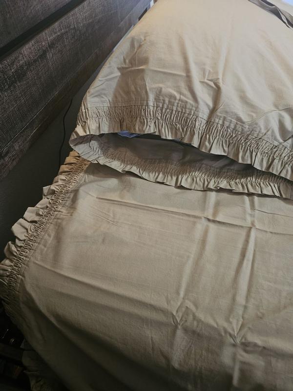 This Ruffle Sheet Set is woven of cool cotton percale, garment washed for lived-in softness, and features a delicately embellished trim. It comes in assorted colors and coordinates beautifully with our solid garment washed percale bed linens (sold separately).
