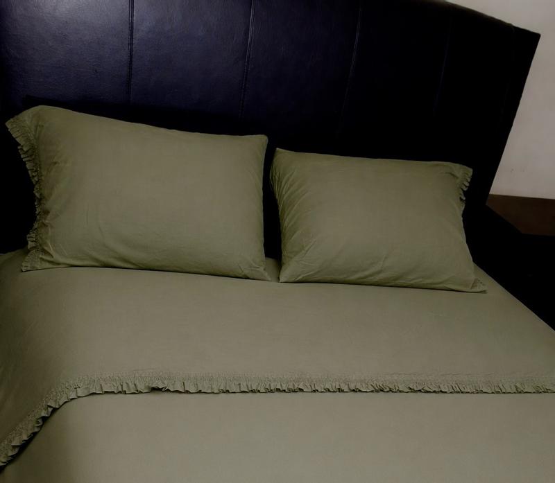 This Ruffle Sheet Set is woven of cool cotton percale, garment washed for lived-in softness, and features a delicately embellished trim. It comes in assorted colors and coordinates beautifully with our solid garment washed percale bed linens (sold separately).