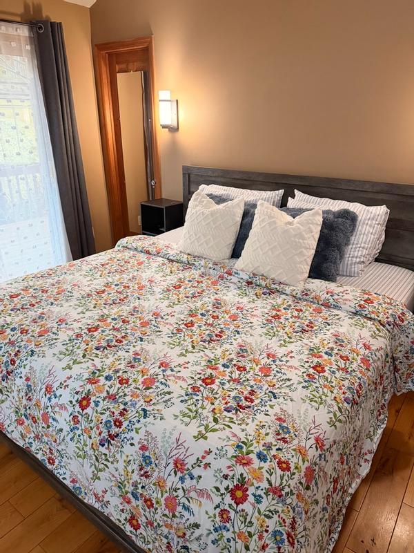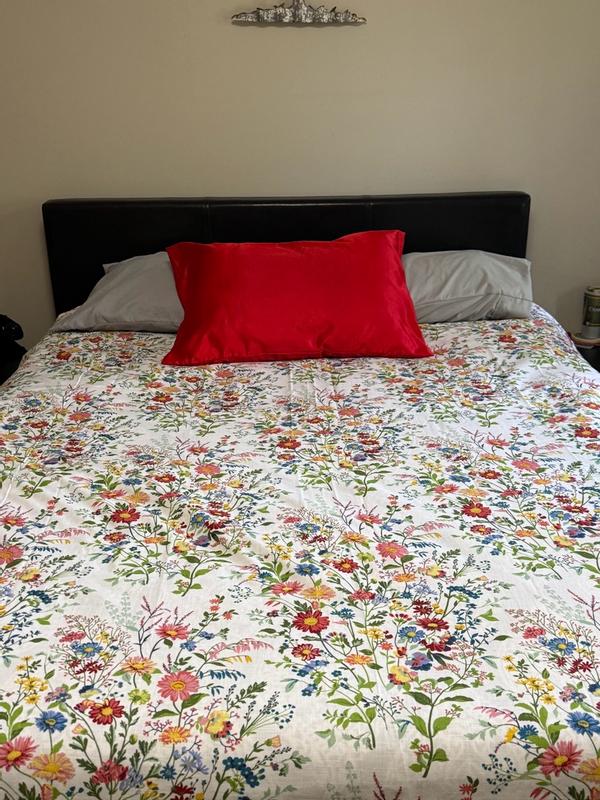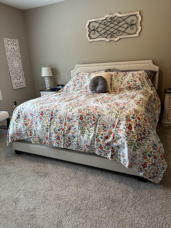 Our Springtime Bouquets Cotton Duvet Cover is based on a vintage pattern and set against a textural white cotton ground for a fresh-yet-familiar feel. It features a colorful field of wildflowers that come to life in joyful shades of pink, lilac, blue, fern green, butter yellow, and claret.