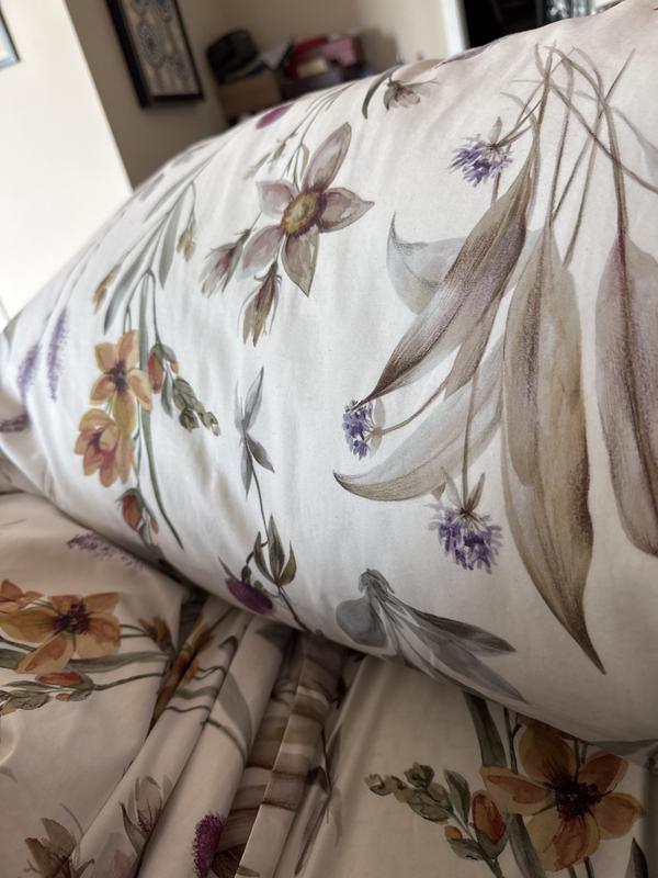 The Stem Florals Sateen Duvet Cover features soft orange blooms, delicate purple thistle-like flowers, and pale pink and white daffodil-inspired blossoms, all beautifully accented by lush green foliage. This harmonious pattern is printed on a soft ivory background, creating a serene and sophisticated aesthetic for any bedroom. Crafted of buttery-soft and breathable sateen, this bedding collection has a subtle sheen and wrinkle-free finish and is perfect for all-season comfort.