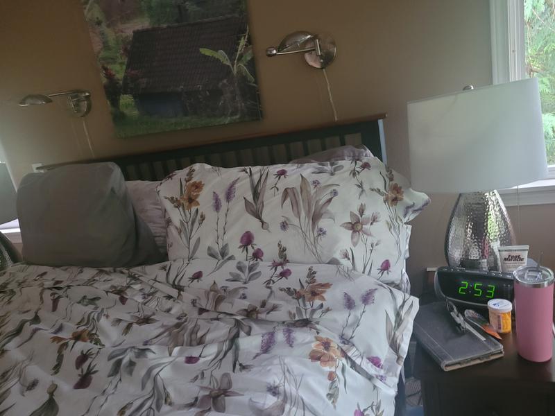 The Stem Florals Sateen Duvet Cover features soft orange blooms, delicate purple thistle-like flowers, and pale pink and white daffodil-inspired blossoms, all beautifully accented by lush green foliage. This harmonious pattern is printed on a soft ivory background, creating a serene and sophisticated aesthetic for any bedroom. Crafted of buttery-soft and breathable sateen, this bedding collection has a subtle sheen and wrinkle-free finish and is perfect for all-season comfort.