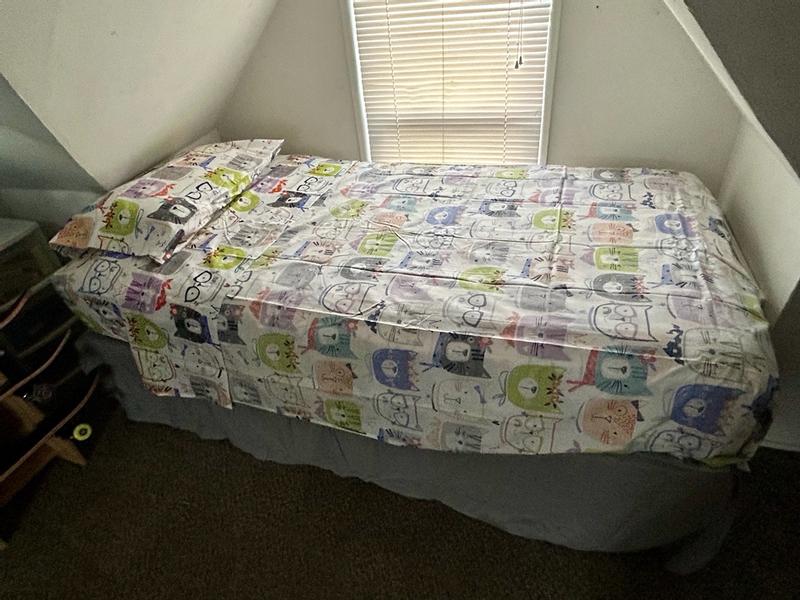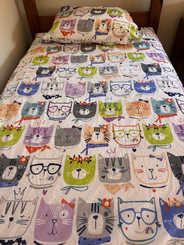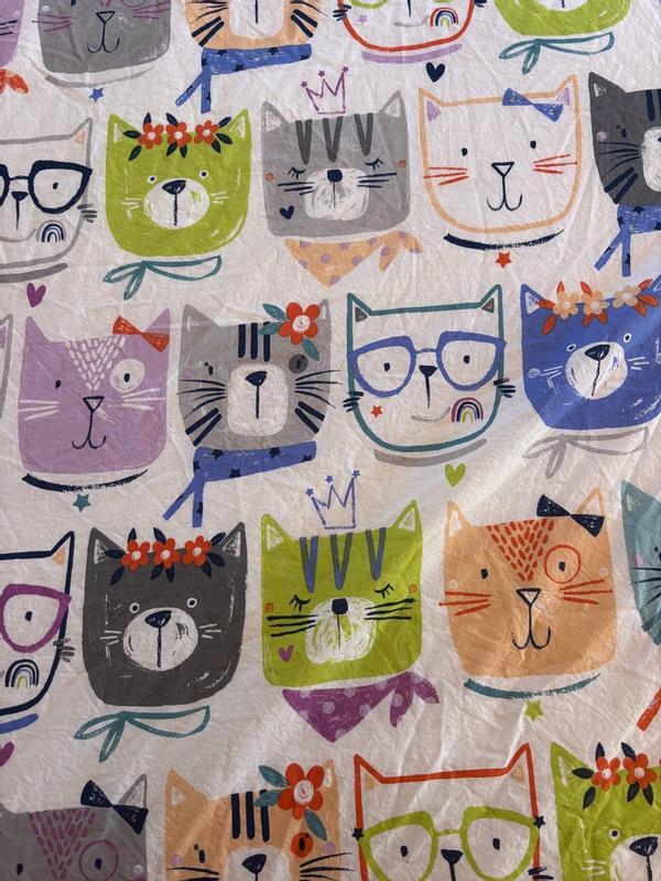 The cat-themed sheets are generally well-received for their high quality, softness, and durability. Customers praise the vibrant, whimsical print that adds a fun, cheerful element to their bedrooms. The sheets are also noted for staying crisp and wrinkle-free after washing. However, some customers were disappointed with the thinness of the sheets and felt the price increase was unreasonable. Overall, the majority of customers are very satisfied with the quality, comfort, and design of these sheets.