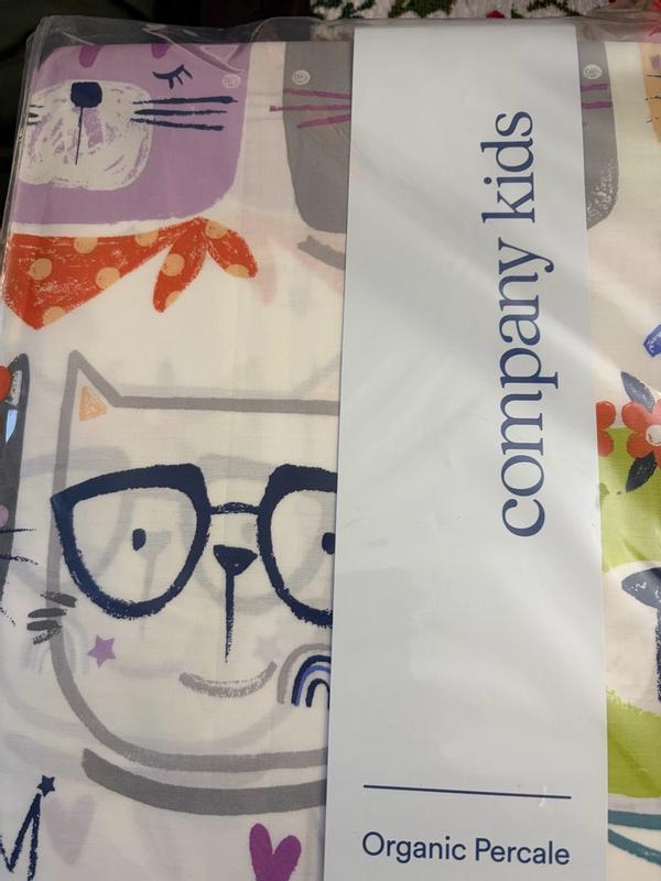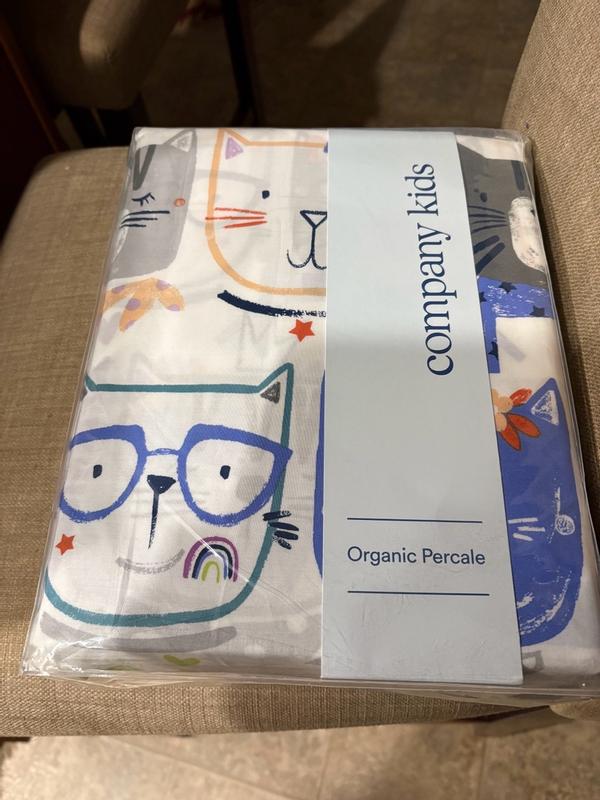 Gussied up with bows, eyeglasses, scarves, and flowers, the stylish cats on this printed cotton percale sheet set are dressed to the nines—maybe even the tens! Based on original artwork, these friendly felines brighten the bed in cheerful shades of pink, turquoise, orange, blue and gray on a white ground. Sewn of organic cotton percale, this earth-friendly collection has a cool, crisp hand that gets better with every wash.
