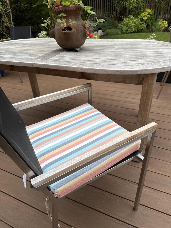 - Striped cushions are “flow matched” ensuring the stripes line up through the piping and the front of the cushion