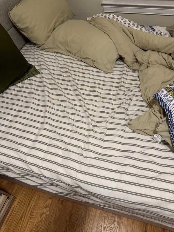 The sheets are made of high-quality, soft, and crisp percale cotton fabric that customers find durable and attractive in various striped patterns. The fitted sheets have deep pockets that fit mattresses well. While a few customers found the sheets to be a bit rough or wrinkly after washing, or had issues with the fitted sheet not fitting properly, the majority of customers are very satisfied with the comfort, style, and value of the product.