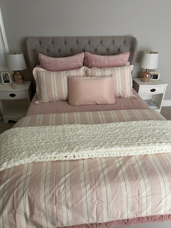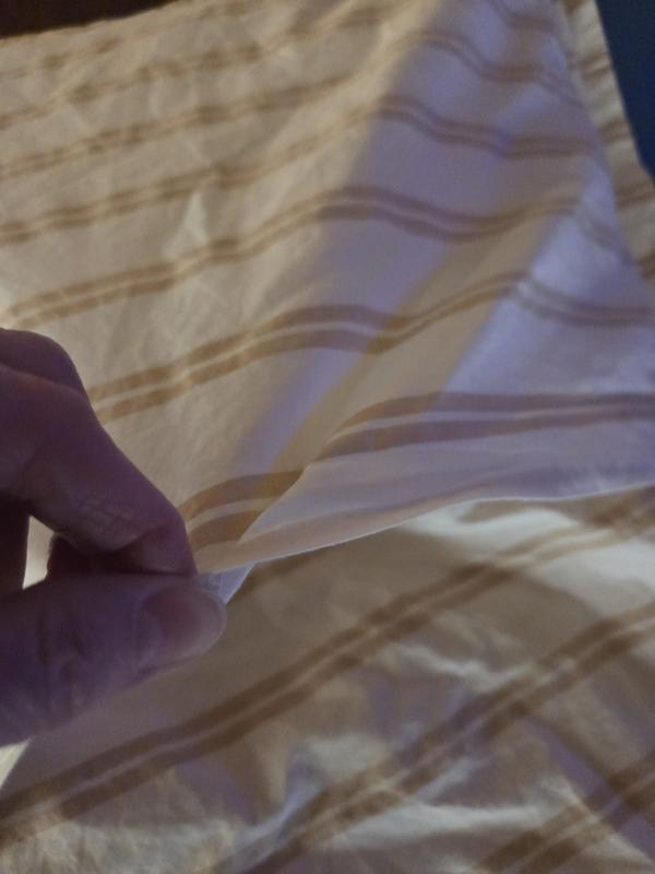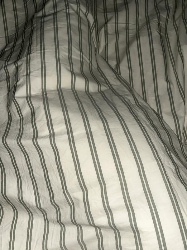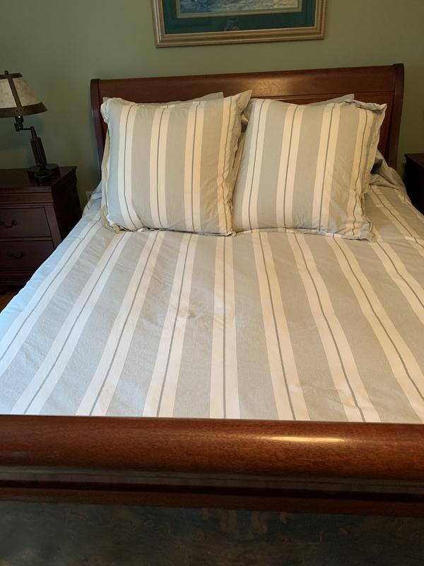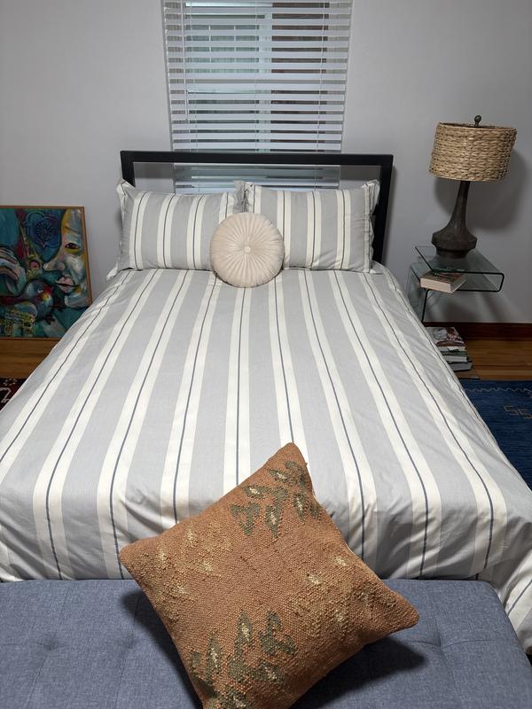 The bedding set is made of high-quality 100% cotton percale fabric that provides a soft, crisp, and cool sleeping experience. Customers praise the elegant, understated, and timeless design of the classic striped pattern. However, some note the color does not always match the online images, and a few find the fabric slightly rough or thin, though it may soften with washing. Overall, most customers are very satisfied with the excellent quality and value of the product.