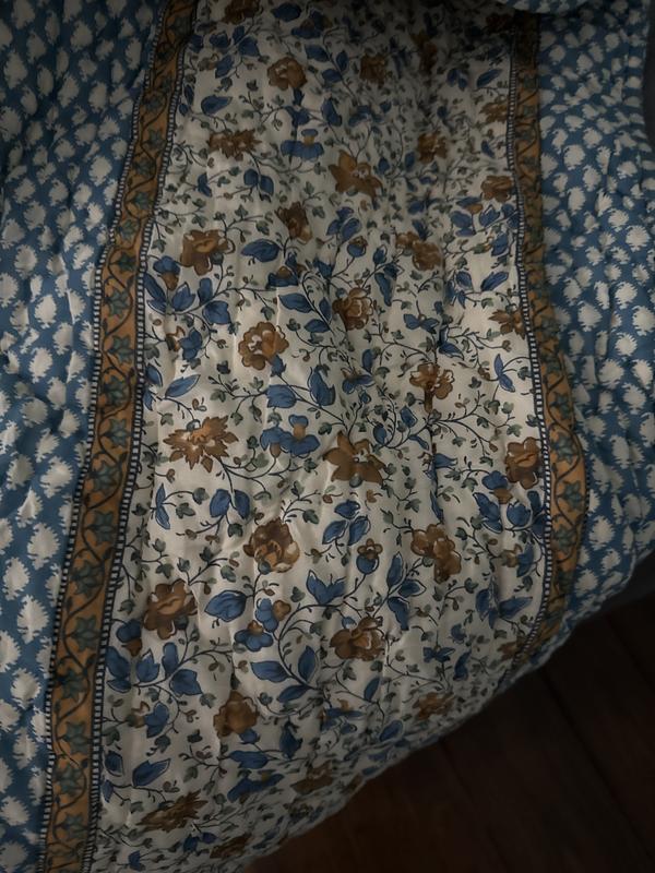 The Naavi Cotton Quilt pays homage to the artistry of handcrafted Indian textiles with captivating stripes of delicate indigo paisleys and gold florals. The reverse side showcases a stunning paisley pattern, offering two distinct looks in one quilt. This versatile piece coordinates effortlessly with our sheet sets, allowing you to create a unique and eclectic aesthetic for your bedroom. Handcrafted by skilled artisans and washed for lived-in softness so it’s as comfortable as it is beautiful. Part of the VILLA D’ASCOLI x The Company Store collection.