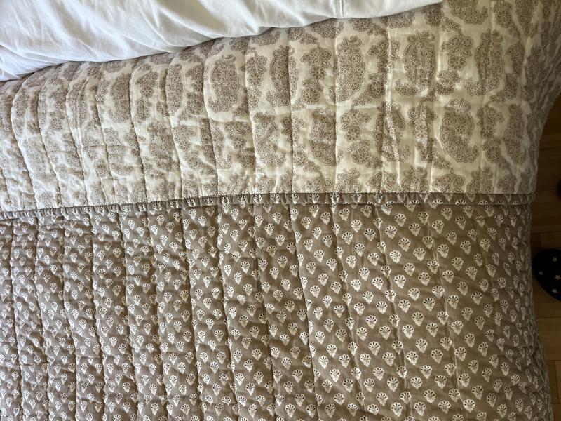 Elevate the bedroom with the handcrafted VILLA D'ASCOLI Jiya Reversible Quilt, a masterpiece of artisanal craftsmanship and timeless design. Inspired by the intricate block prints of Jaipur, this quilt features an elegant paisley motif on a serene natural ground, reversing to a smaller, coordinating print that adds a delightful textural contrast. Available in two timeless shades, taupe and blue. Made by skilled artisans and washed for lived-in softness, this quilt is as comfortable as it is beautiful. Part of the VILLA D’ASCOLI x The Company Store collection.