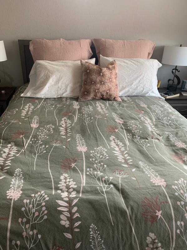 - Reverses to a dyed to match solid 200-thread count organic cotton percale