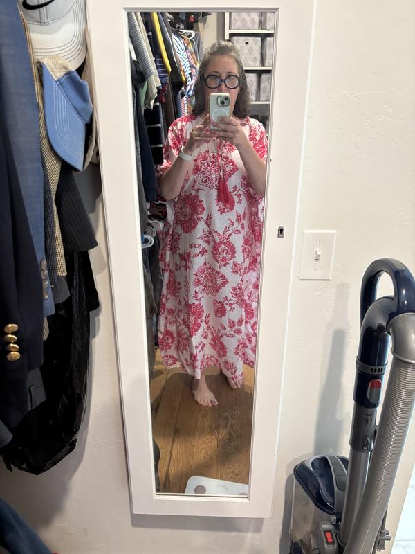 Our Printed Voile Women's Caftan Dress offers stylish elegance with colorful Jacobean flowers in brilliant blue or hot pink hues on a white ground patterned with swiss dots. Perfect for breezy comfort in warm weather, it's effortlessly wearable with a long, relaxed silhouette, a split V-neck, tassels, and elbow-length sleeves.