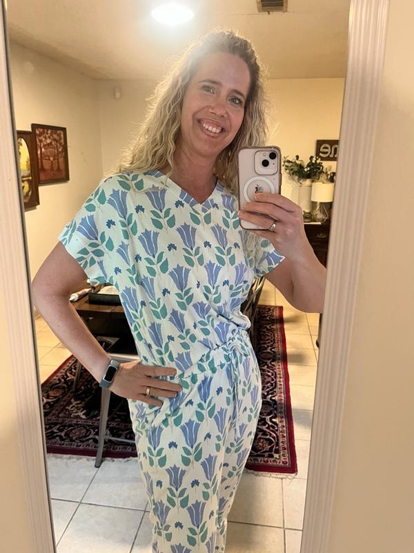 Knit of the world's finest Peruvian cotton, this luxuriously soft women's jogger pajama set is available in two elegant new prints: a petite floral in soft blues (Suhana) and a scrolling Jacobean botanical on a sage green ground (Floral Trail).